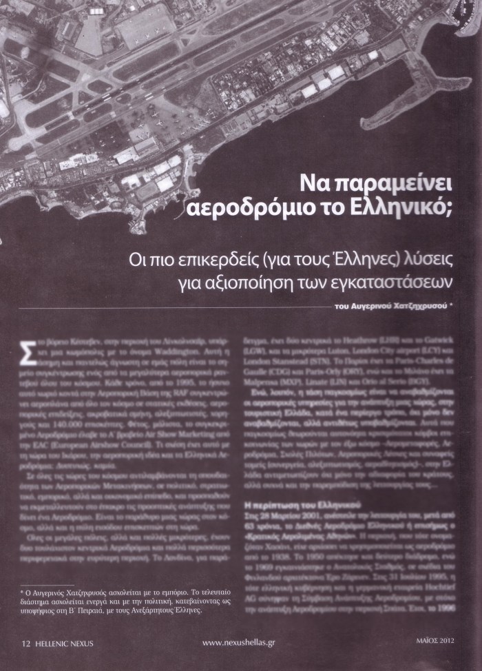 4 Μαΐου, 2012 by @avgerinosx NEXUS Μαϊου: «Να παραμείνει Αεροδρόμιο το Ελληνικό;» του Αυγερινού Χατζηχρυσού. Ευκαιρίες αλλά και εγκληματικές αποφάσεις για την τύχη του Αεροδρομίου του Ελληνικού Στο Nexus, τεύχος Μαϊου που κυκλοφορεί στα περίπτερα! . Κοινοποιήστε: Μοιραστείτε στο X(Ανοίγει σε νέο παράθυρο) Χ Mοιραστείτε στο Facebook(Ανοίγει σε νέο παράθυρο) Facebook Μοιραστείτε στο Pinterest(Ανοίγει σε νέο παράθυρο) Pinterest Κοινοποίηση στο Tumblr(Ανοίγει σε νέο παράθυρο) Tumblr Μοιράσου στο WhatsApp(Ανοίγει σε νέο παράθυρο) WhatsApp Περισσότερα Μοιράσου στο Reddit(Ανοίγει σε νέο παράθυρο) Reddit Εκτύπωση(Ανοίγει σε νέο παράθυρο) Εκτύπωση Στείλε ένα σύνδεσμο σε έναν φίλο(Ανοίγει σε νέο παράθυρο) Email Μου αρέσει! Φόρτωση... Σχετικά